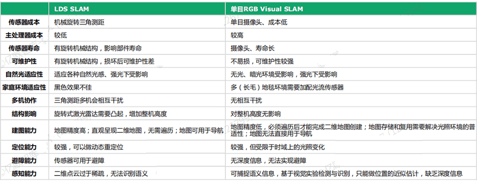 LDS SLAM 與 VSLAM 各有優(yōu)劣,二者相容或成為行業(yè)主流發(fā)展方向之一。對比 LDS SLAM 技術(shù)與單目 VSLAM 技術(shù),其中 LDS SLAM 技術(shù)可視范圍廣(VSLAM 只有50-60度),環(huán)境適應(yīng)性更強(qiáng),地圖精度更G,同時能夠獲取深度信息,可以應(yīng)用于避障;而VSLAM技術(shù)成本更低,攝像頭的壽命長、不易損、不增加機(jī)身G度,同時能夠捕捉語義信息,提升地圖分區(qū)精度。
