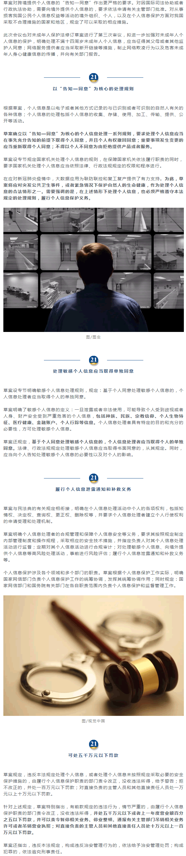 據(jù)介紹,草案共八章70條,明確了適用范圍,健全了個(gè)人信息處理規(guī)則,完善了個(gè)人信息跨境提供規(guī)則,明確個(gè)人信息處理活動(dòng)中個(gè)人的權(quán)利和處理者義務(wù),并明確履行個(gè)人信息保護(hù)職責(zé)的部門(mén)。