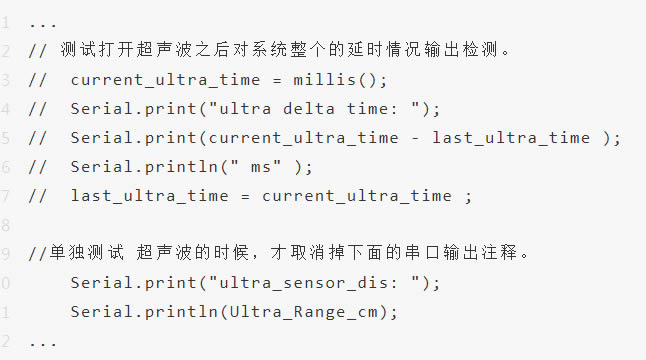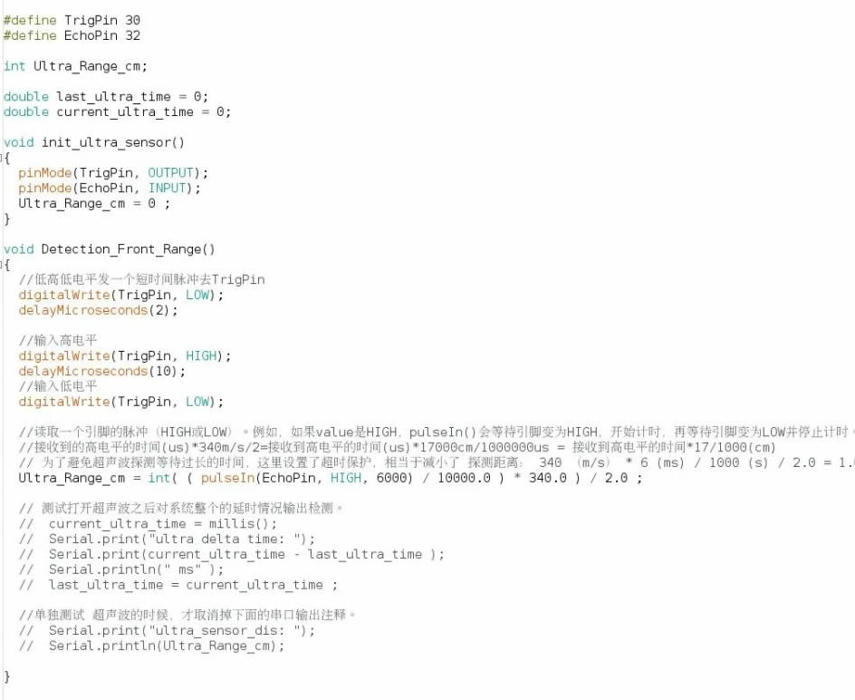 該程序定義了一個(gè)存儲(chǔ)測(cè)距信息的變量 Ultra_Range_cm , 測(cè)距范圍為“0-1m”。此時(shí),我們可以看見(jiàn)下面有兩大段注釋。其中,D一段是用來(lái)測(cè)試整個(gè)系統(tǒng)功能執(zhí)行一遍所需要的時(shí)間,若取消掉注釋?zhuān)纯稍?串口監(jiān)視器 實(shí)時(shí)查看輸出的時(shí)間信息。